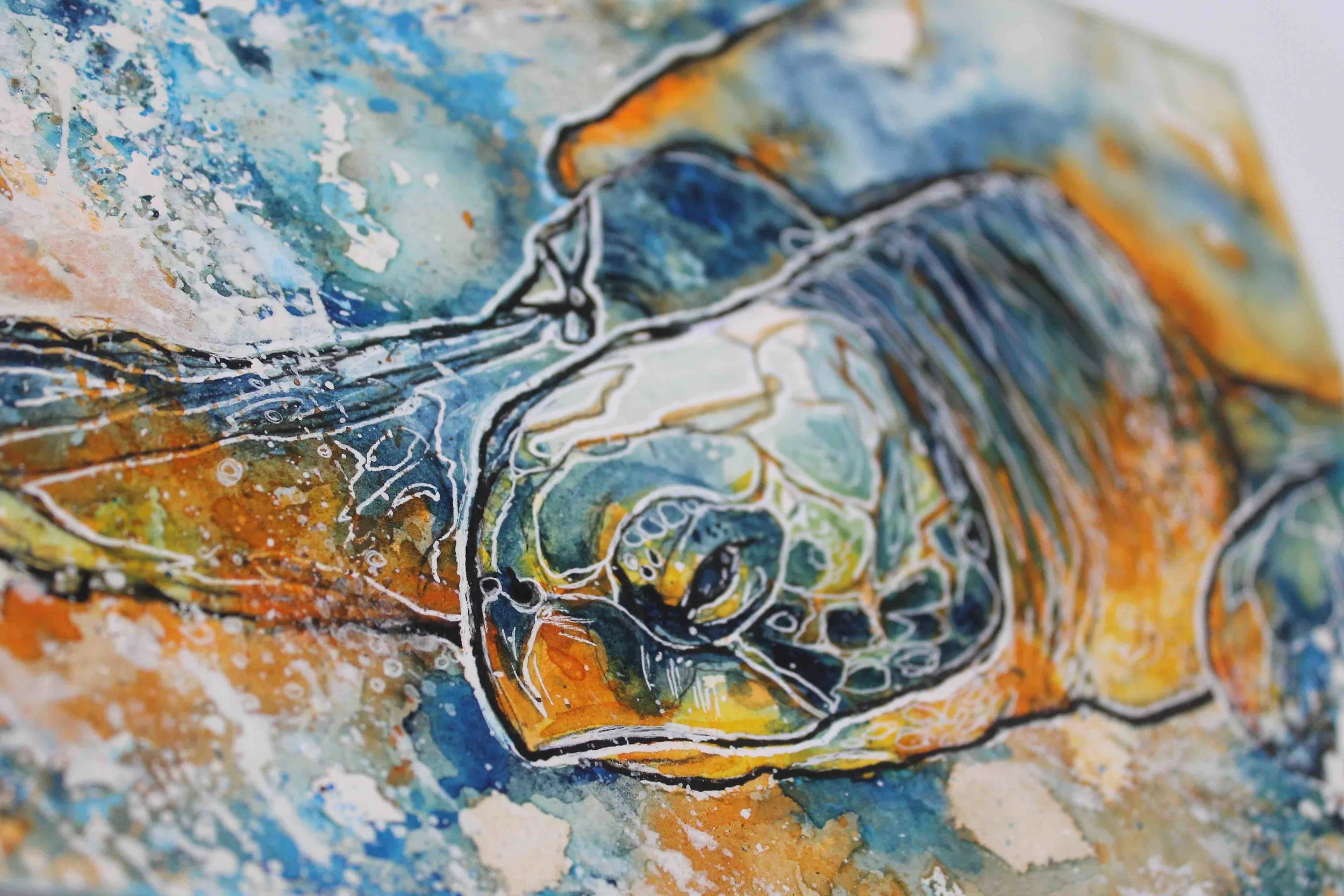 I found this long lost sea turtle sorting through my artwork a few weeks ago. I really like the way the watercolours merge on his shell, and I created the sea foam and splashes using white inks which I defined with white pen.