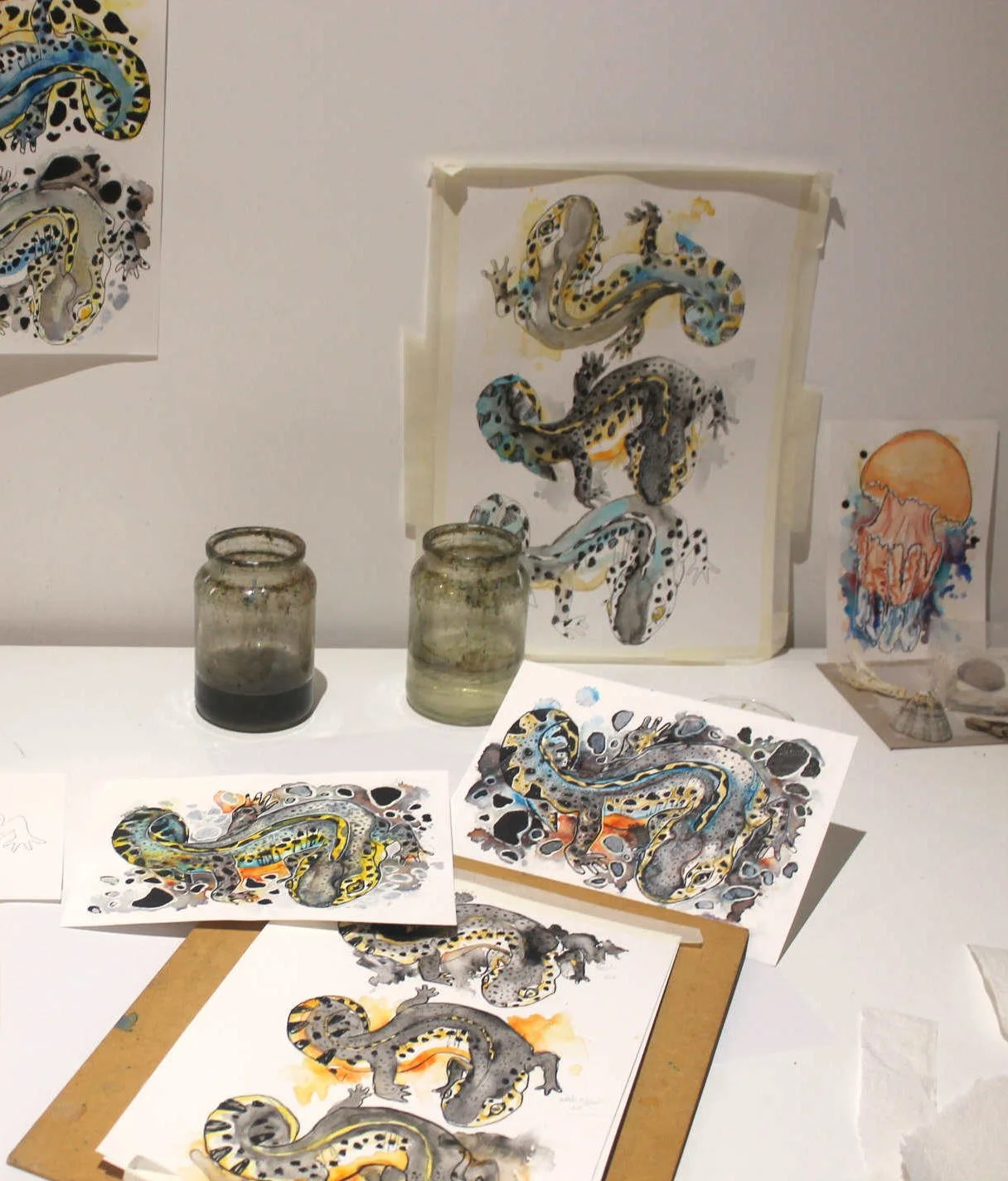 This little guy was one of three alpine newts that I presented for a commission. I’ve included a little of the “behind the curtain” typical evening scene.