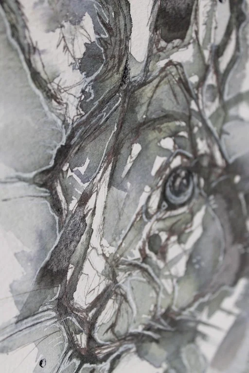 Pulling more inspiration from our rabbity friends, I bled them using fineliners. I drew the image in pencil then drew over them with fineliner and added water to create this bleary imagery.