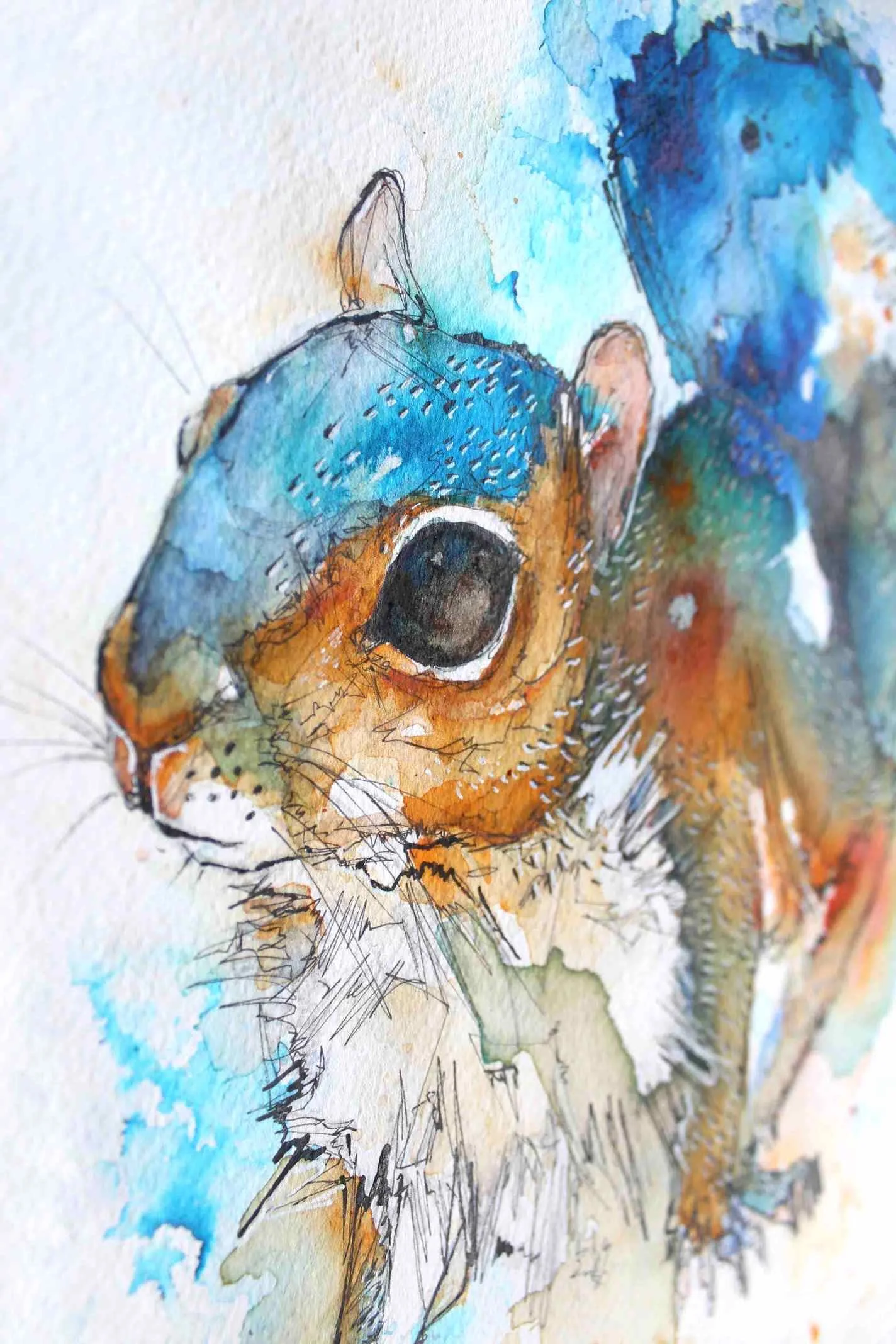 This is a quick piece I created focusing on the blues and greys in a squirrels fur - which quickly got out of hand and I decided to paint the whole squirrel blue. This squirrel was primarily painted in Brusho pigment.