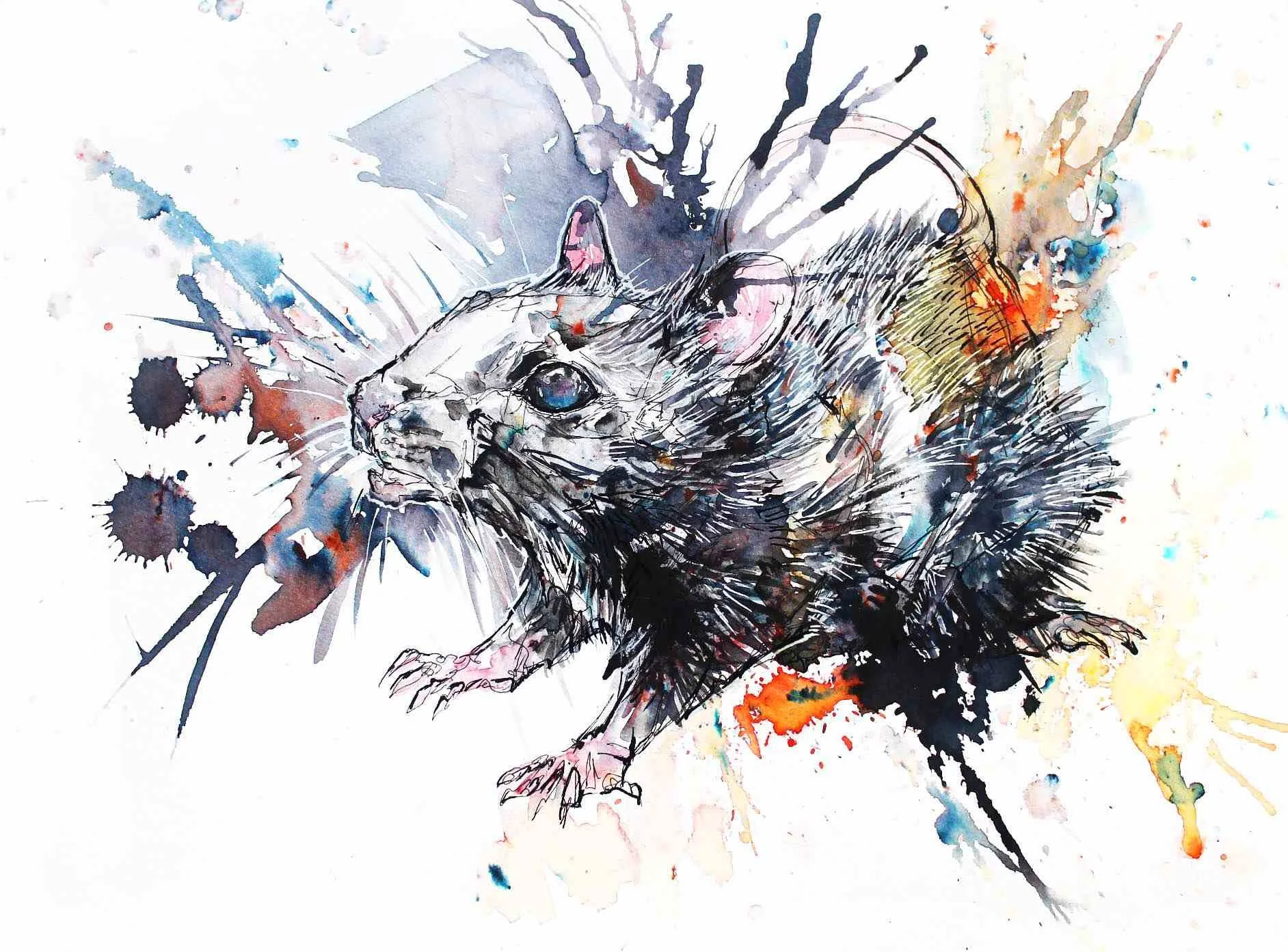 This rat is painted mostly in brusho, I shook some of this pigment onto my cold pressed paper — flicked some water at the dry pigment and colour was born! This rat painting is available in my shop.