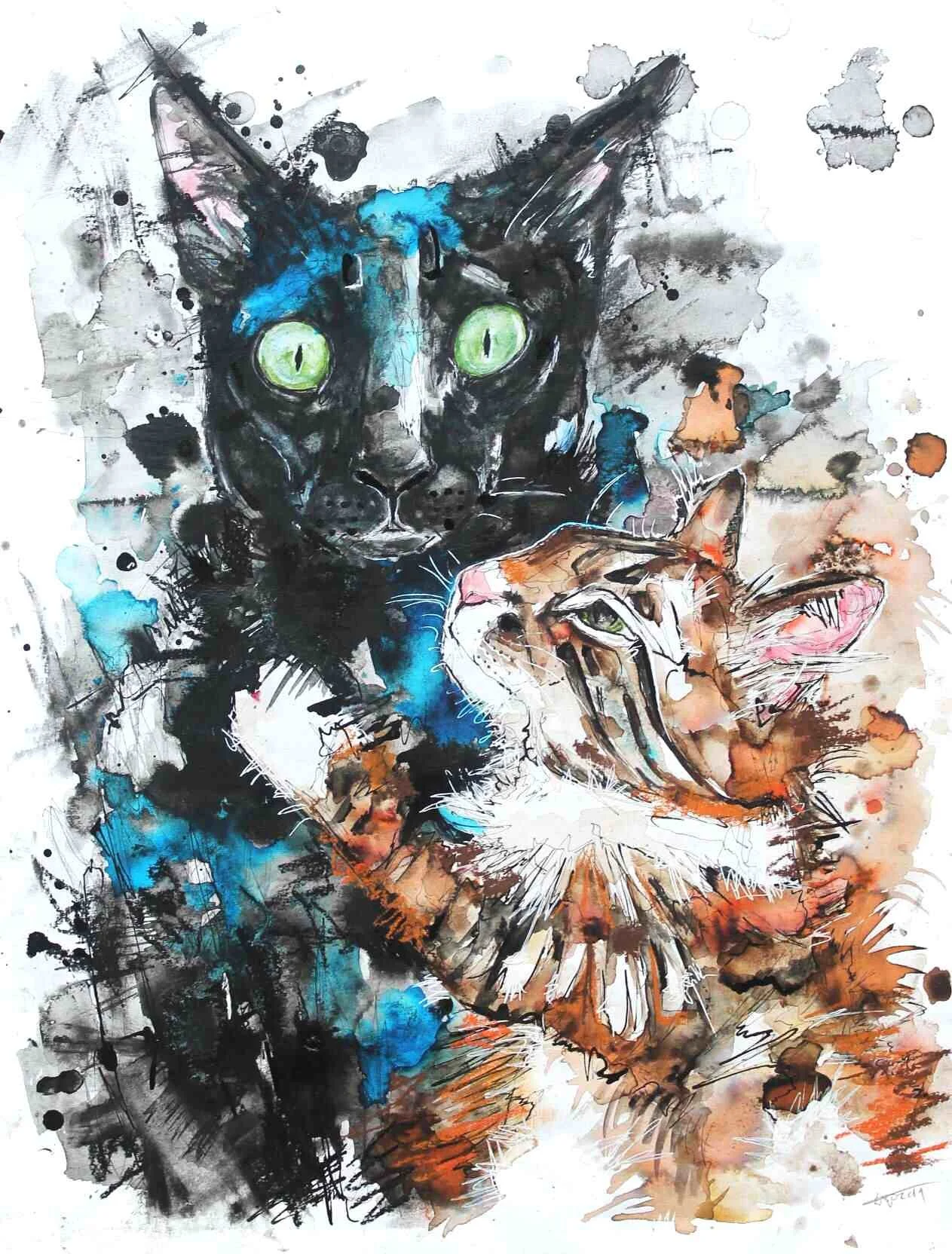 I used a variety of different materials to create these paintings, I found that using charcoal and pastel over a watercolour painting created some really great fur texture, along with scribblings of white pen.
