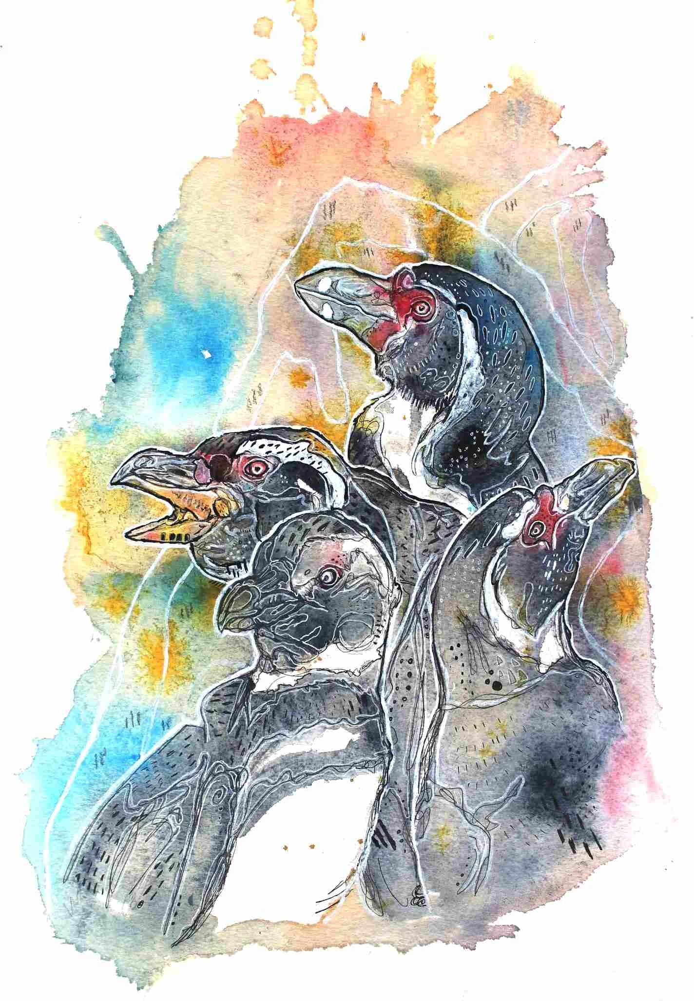 For the theme of ‘Together’ I thought about a bustling bunch of Magellanic penguins and for even more closeness I attached the penguins with an unbroken continuous line, how cosy! Then fought with a little bit of patterning, which I then finished with coffee, ink, watercolour and pigment.