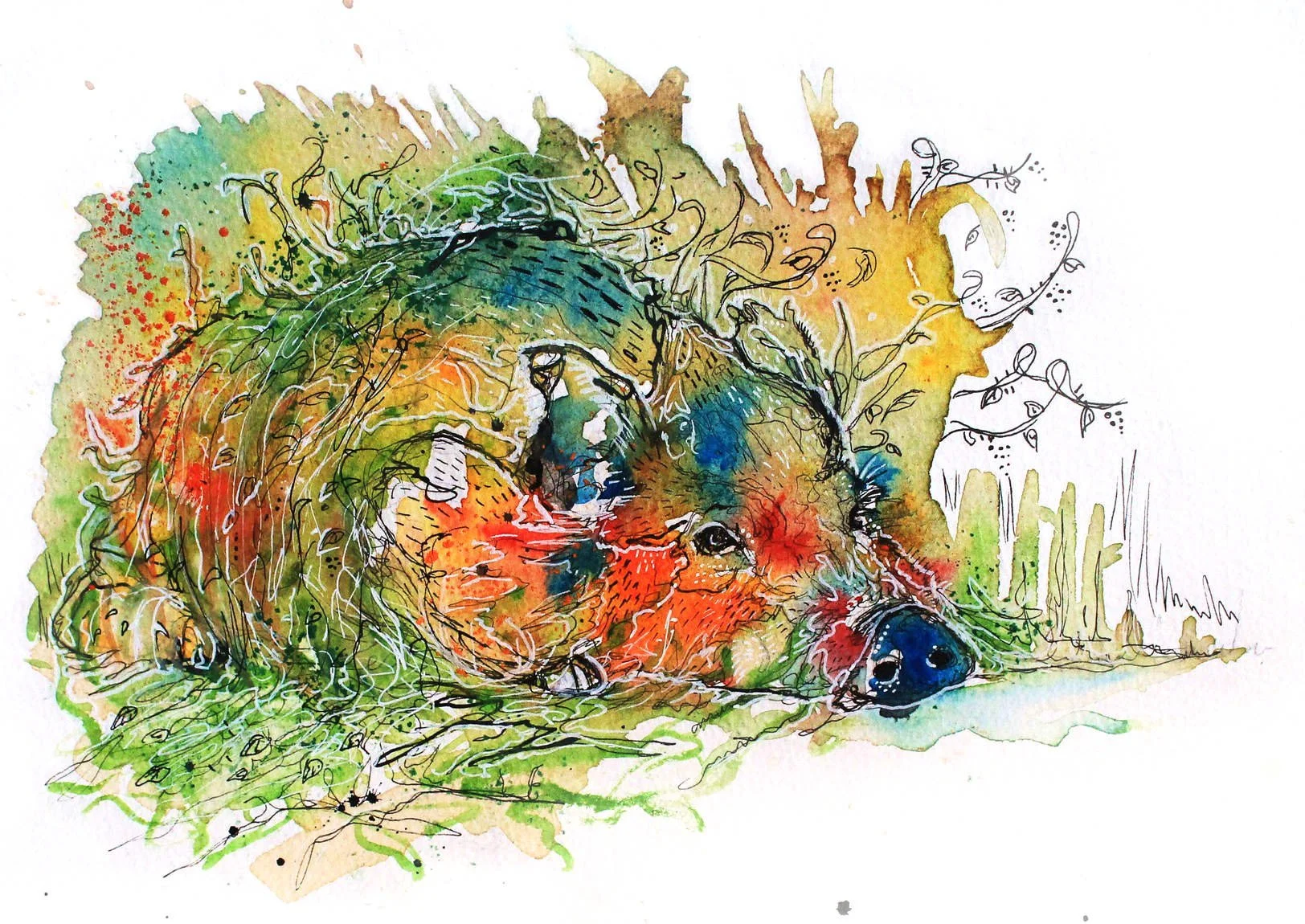 This weeks Illustration Friday is ‘Entangled’ and I liked the thought of a wildly boar wrapped up in foliage. Using coffee, watercolour and ink I was able to do a quick painting of a little hoglet looking rather wrapped in plant life.