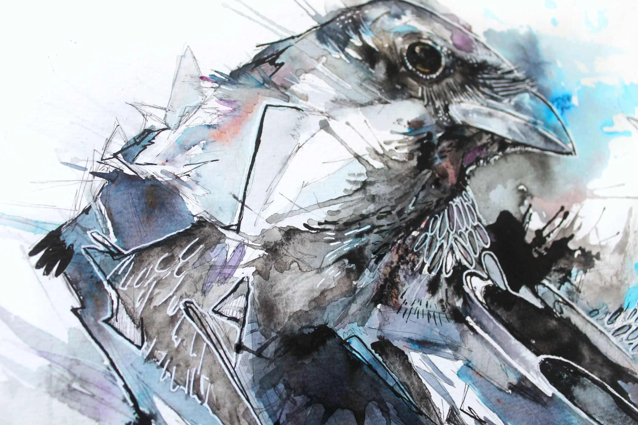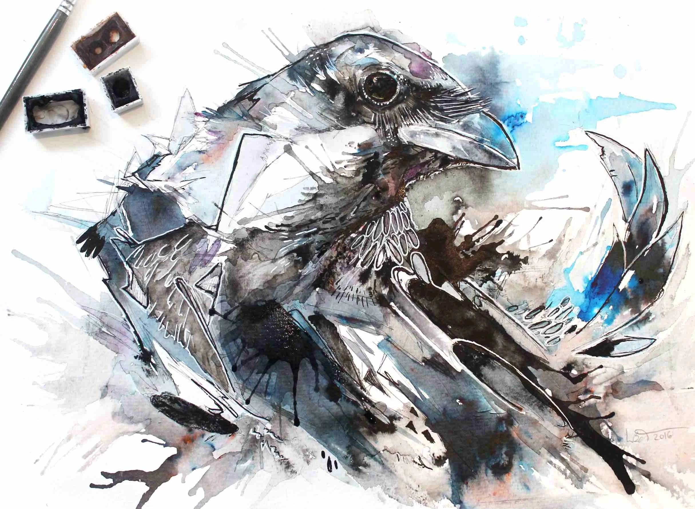 This painting was created in watercolour, Indian ink and brusho. Brusho gives such vibrant colour with the smallest application, it's replacing my need for ink at the moment just because it's easier to remove from paper and more forgiving than inks, perfect for blundering Lauras. This crow is available in my shop.