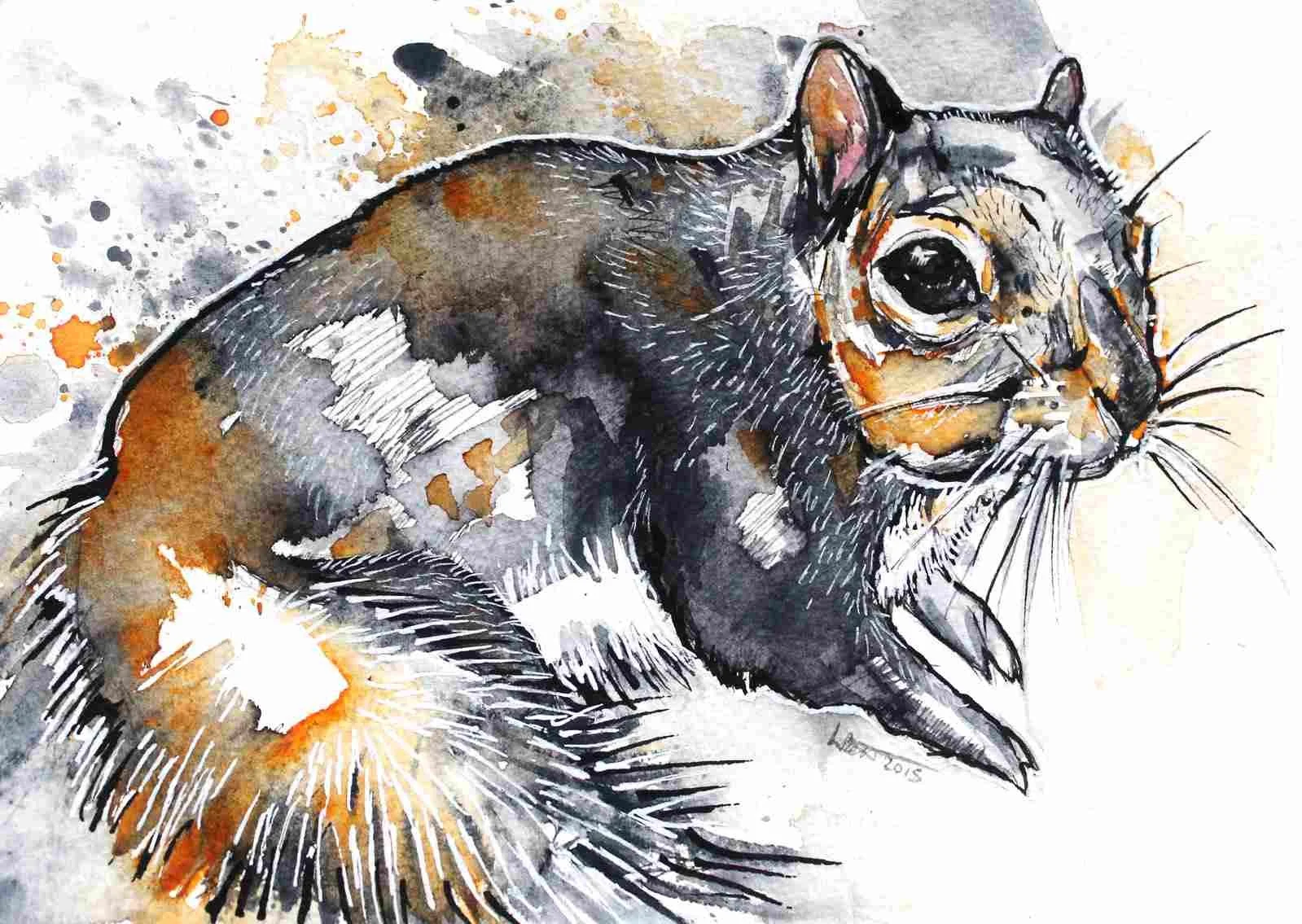 There’s a surprising amount of orange in the grey squirrels fur, so I’ve over dramatised this to create a fiery effect using watercolours and inks.