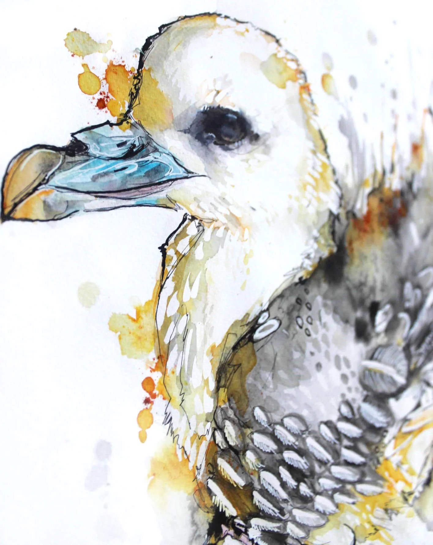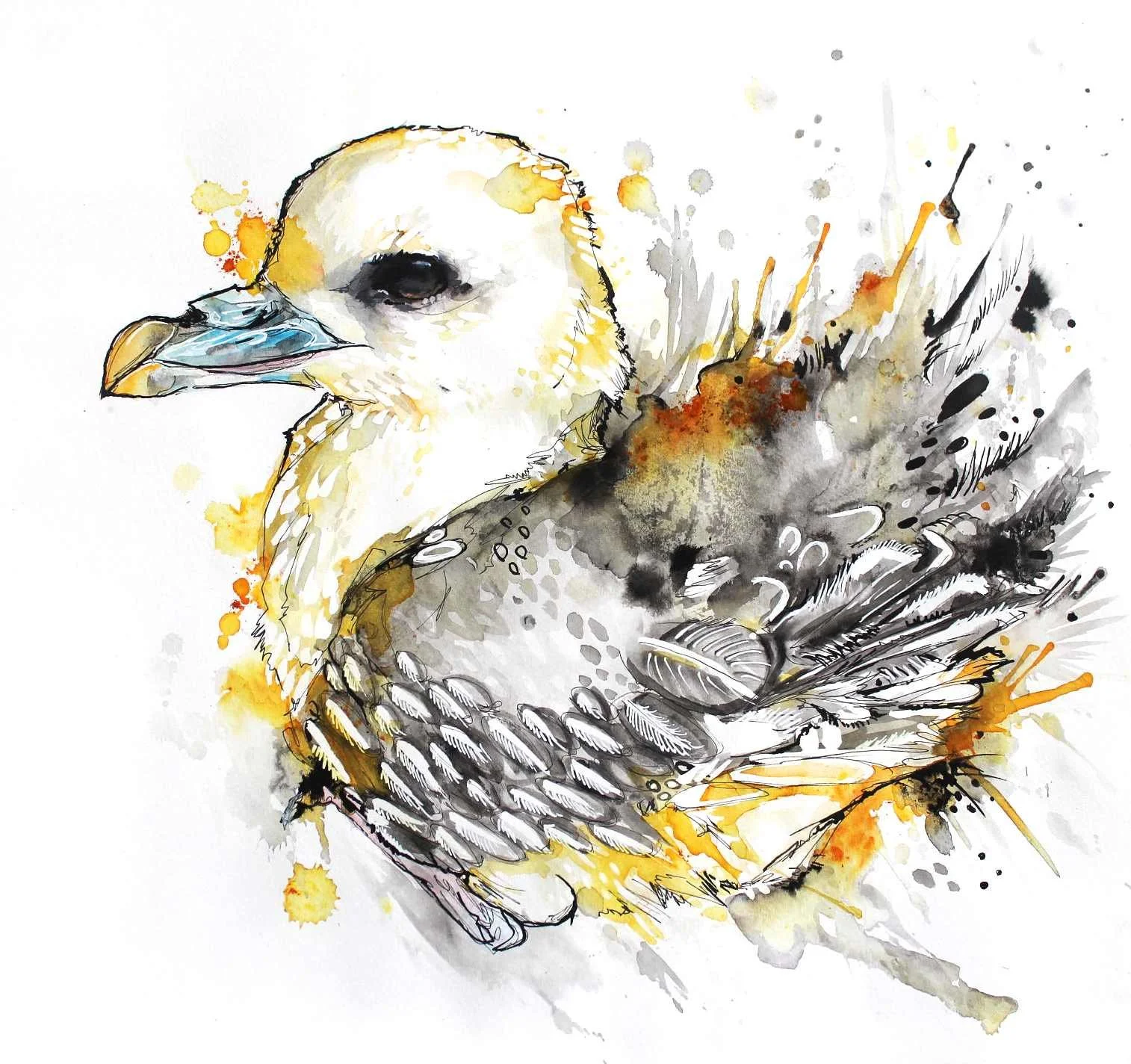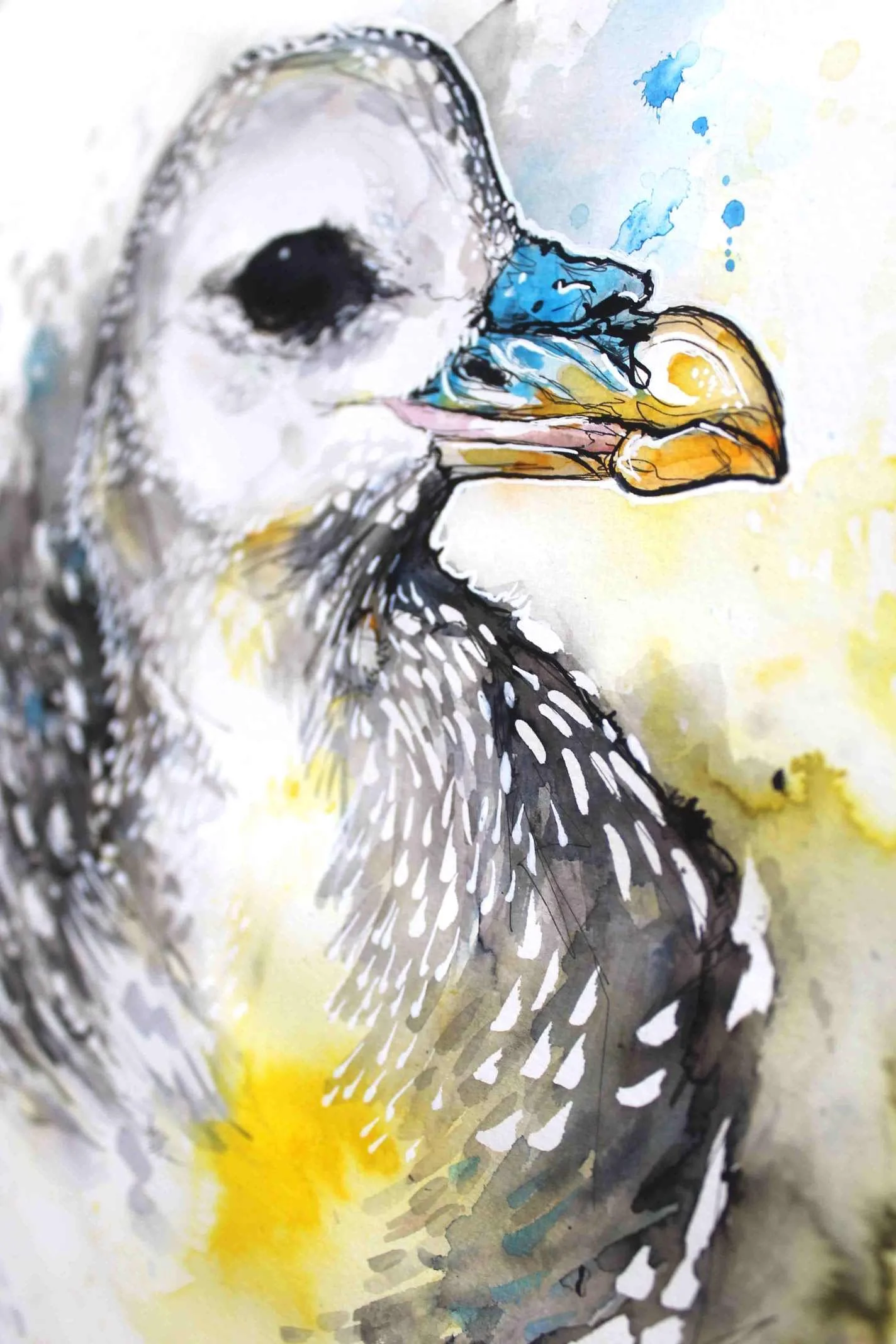I’ve used a fair bit of masking fluid to preserve the white of the paper to form the distinct white feathers.