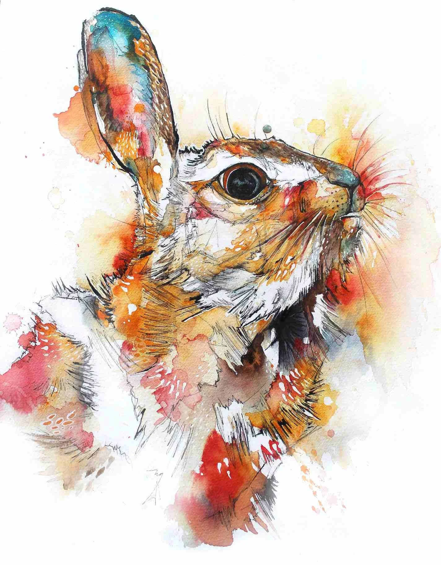 Going wild with the colour palette I’ve painted a green chunky rabbit and a fiery hare. I was aiming to focus on muted colours with a few bright eye catching highlights, but my patience got the better of me and I reached for the Brusho pigment too early, to the benefit of the hare but sadly to the detriment of the rabbit piece.