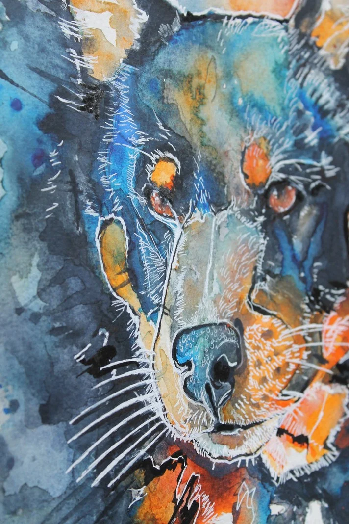 This was a commission piece and was created using watercolour, ink and white pigment and is A4 in size.