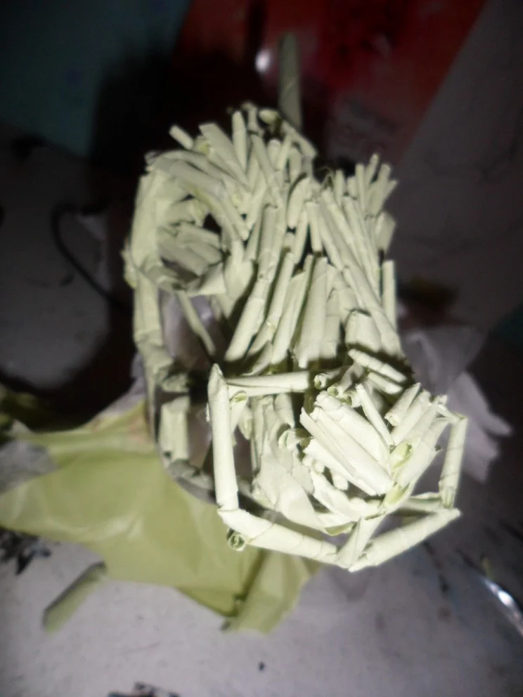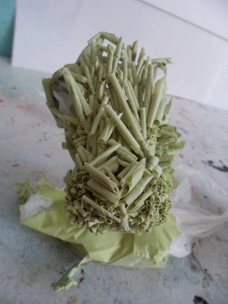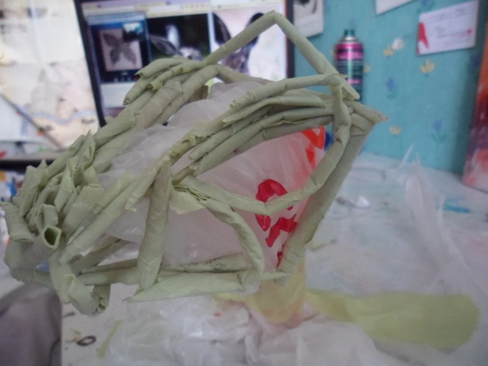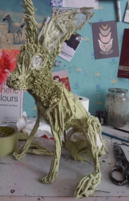 I thought I’d show you the more interesting stages of a luminous masking tape beastie, using masking tape I secure rolled up tubes to a carrier bag base until I have a rough skeleton, then the cutting and shaping of hundreds of sticky tubes takes place. I always think a work in progress is much more interesting half way finished than the final version especially in sculpture.