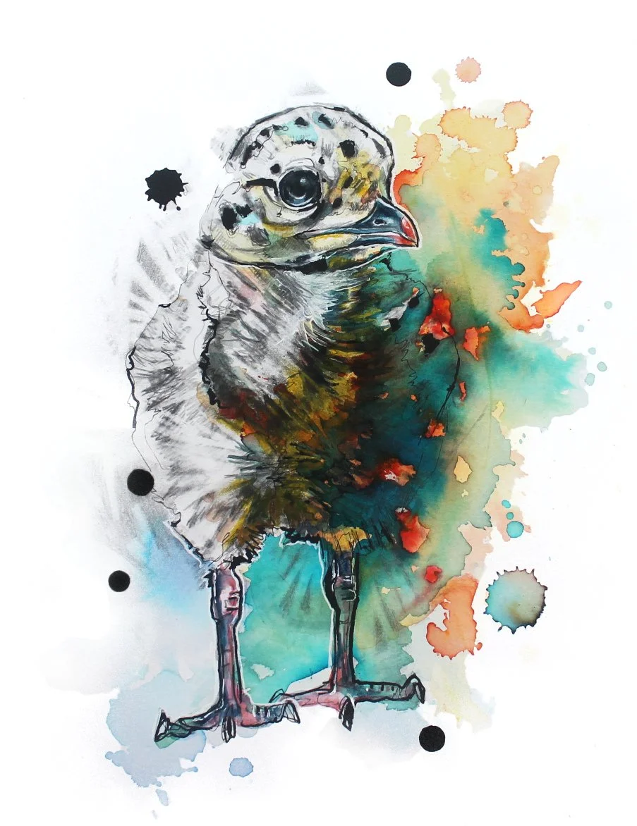 This painting now hanging in the home of the local birdfather was one I made inspired by the little one who hatched on the roof last year, you can read more about this little chick on my NemobySea blog.