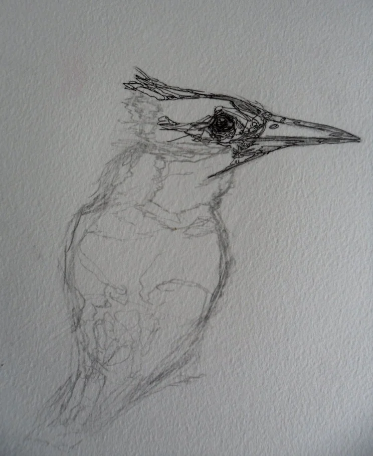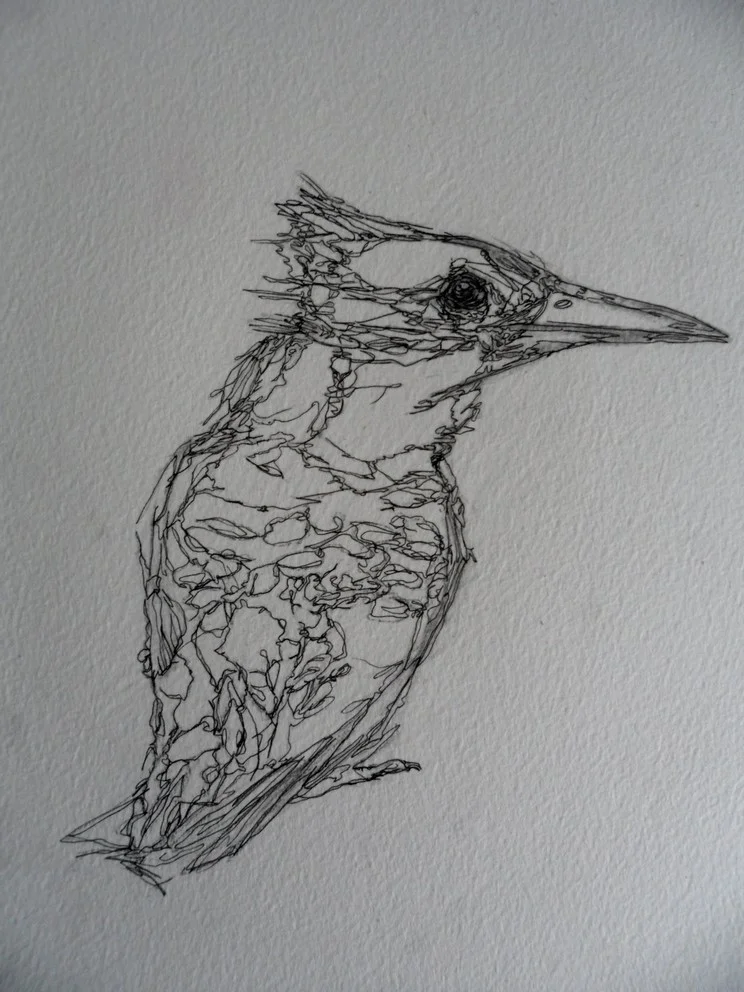 A continuous-line illustration inspired by a pied kingfisher photo by Thom Haslam. This illustration was made using watercolour, ink, gouache and white pen.