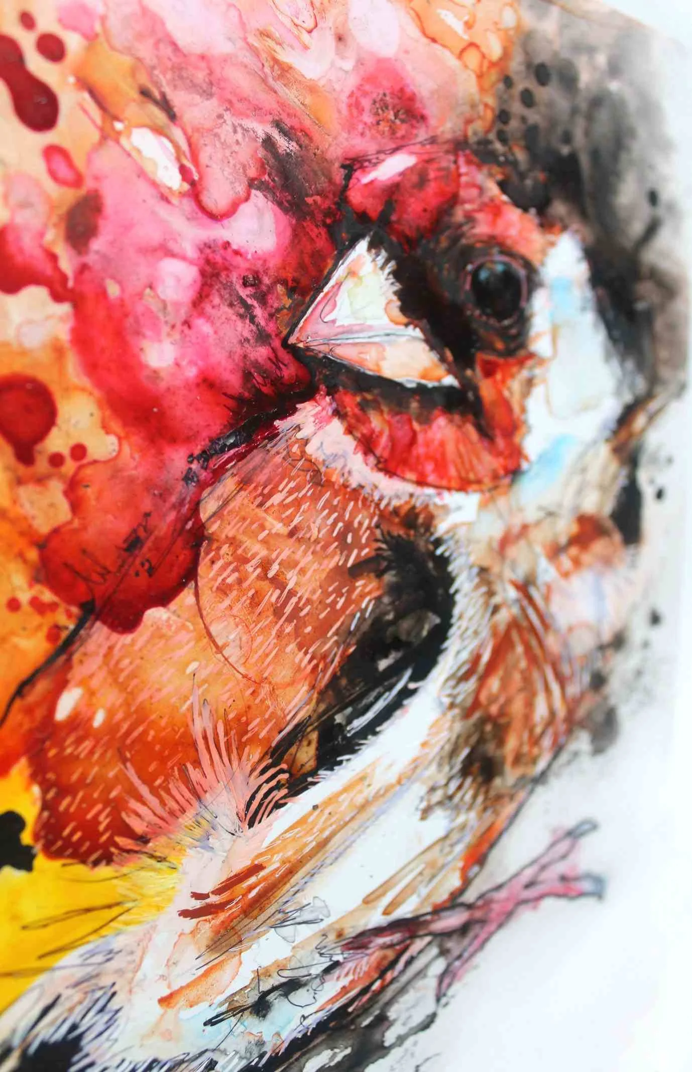 Sticky, rich inks on Yupo paper merge together to help me illustrate the bold European goldfinch and American blue jay. Since moving from South London and into Kent I’ve been treated to an abundance of small, cheeky birds. Goldfinches are partial to dandelions, which we have plenty!
