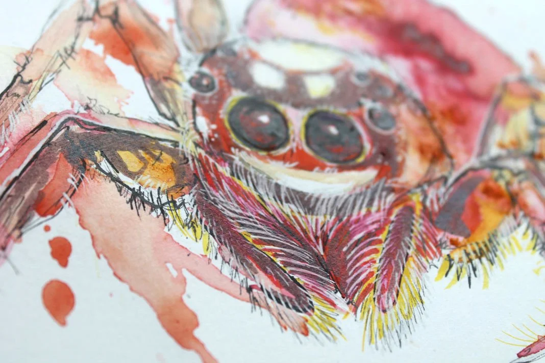 The cloud on his abdomen is so beautiful and I achieved that effect using my trusty Brusho pigments and a little bit of water manipulation. I especially love his eyes, which is always the feature I concentrate on the most with every painting I do — maybe the take away is if I spent as much time on every area, I’d have much better paintings.