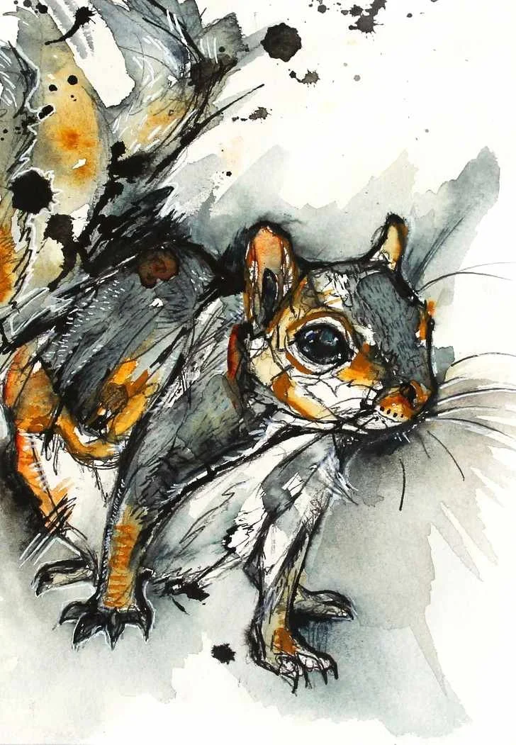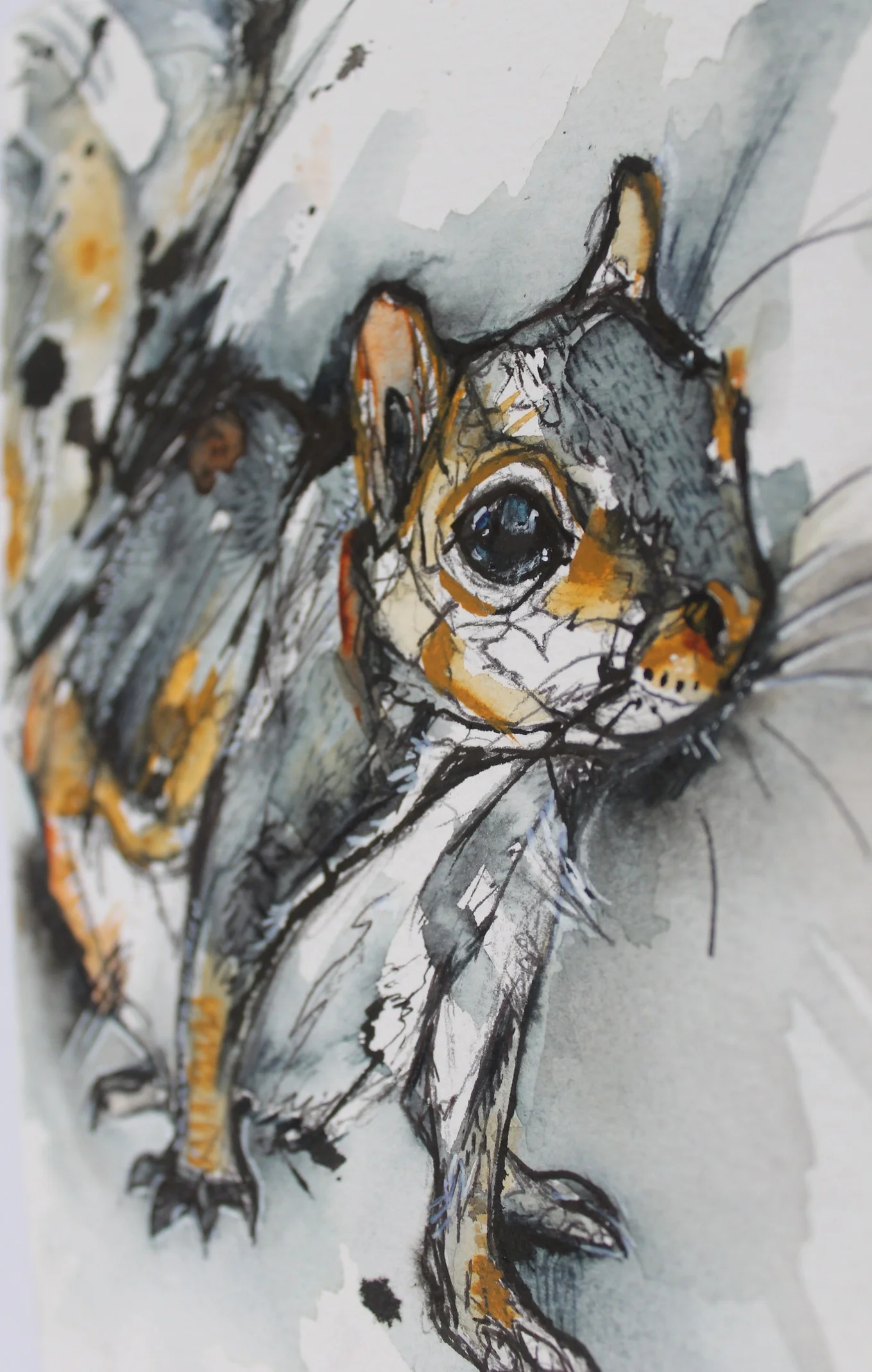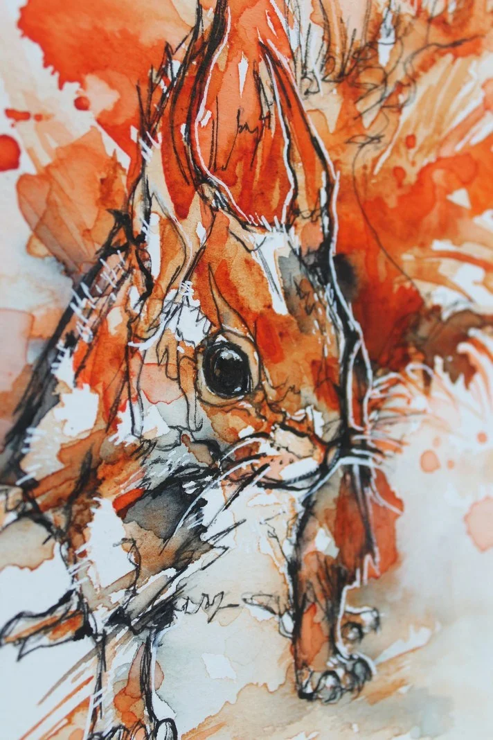 This curious pair were created with watercolour, ink with a touch of fineliner here and there plus white pen. Personally I prefer grey squirrels, as I’m more familiar with them and they are devilishly cheeky. I don’t miss much about living in the city, but I definitely miss the greys.