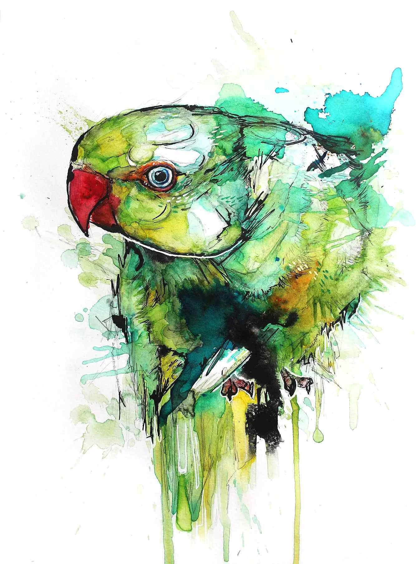 An established species in London and on the south-east of Britain, these beautiful parakeets are rumoured to have been escapees from The African Queen film set. I’ve painted this parakeet using mostly Brusho to get that vibrancy contrasting with the softer watercolour pigments. This parakeet painting is available in my shop.