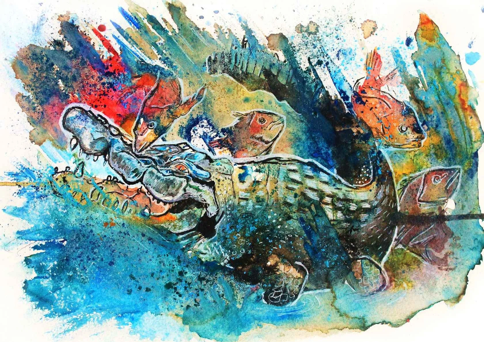 With the crocodile I relied more on pastels heavily to give me the illusion of water, but I think the gouache is much more effective. I included coffee in all of the paintings to add that touch more texture, it muddies the colour somewhat, but it smells good!