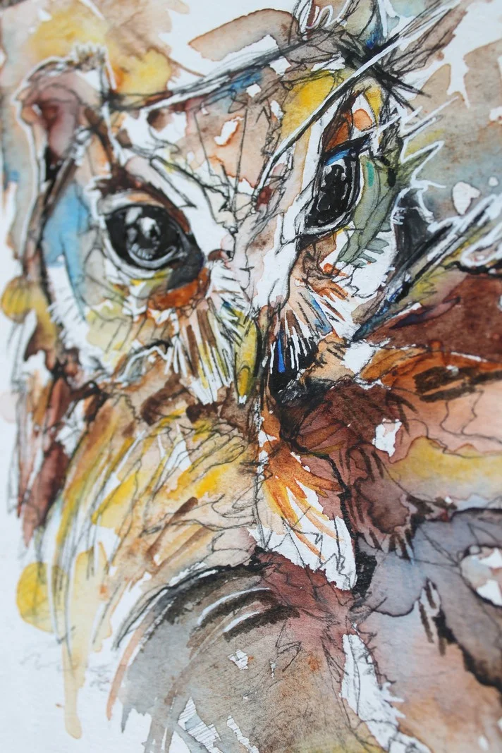 This is a simple painting of a small brown owl I took an interest in. I drew the owl out in fineliner and added watercolour and ink to the finished drawing, after the application of paint I used white pen to bring out certain features. This owl is available in my shop.