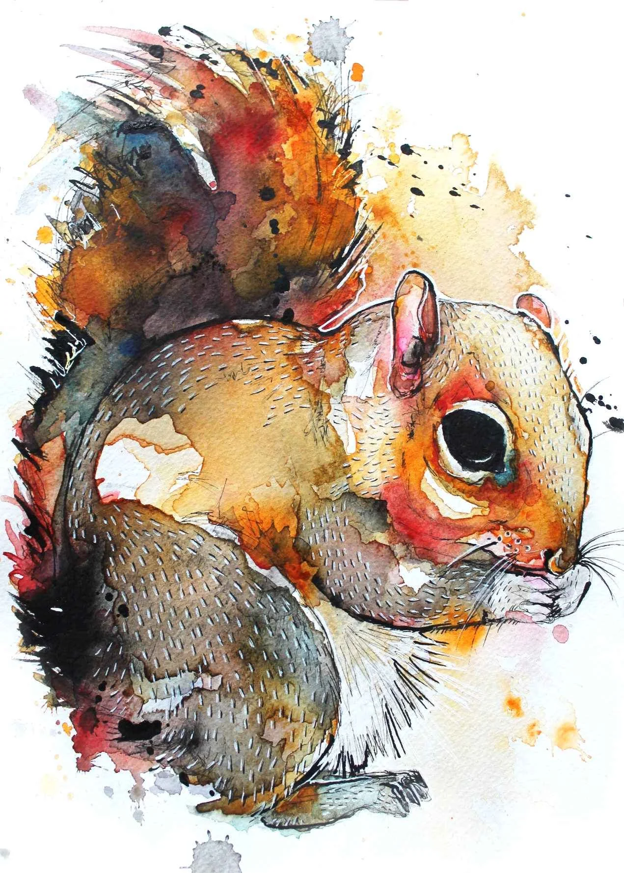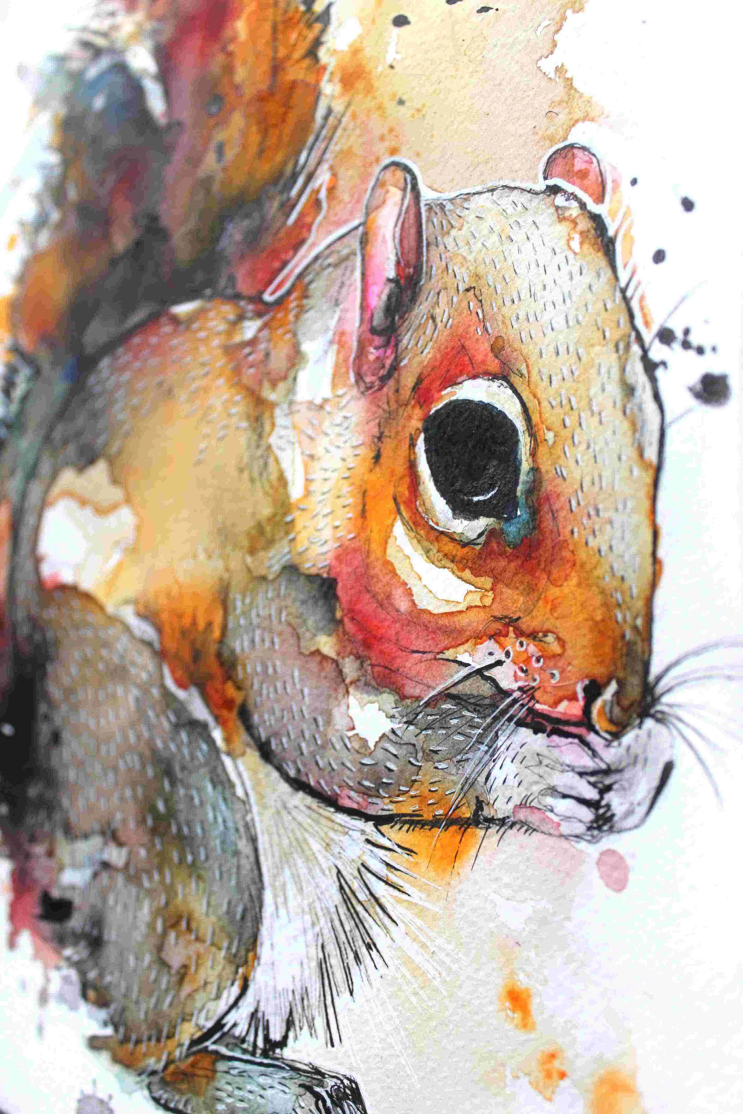 A simple Brusho, watercolour and ink painting just sneaking in before the first month of 2017 is over! This squirrel was part of a trio of squirrels I created for a commission. I’m quite happy with this one, I concentrated on my favourite colour to use — orange! Because grey squirrels feature orange so why not abuse it?