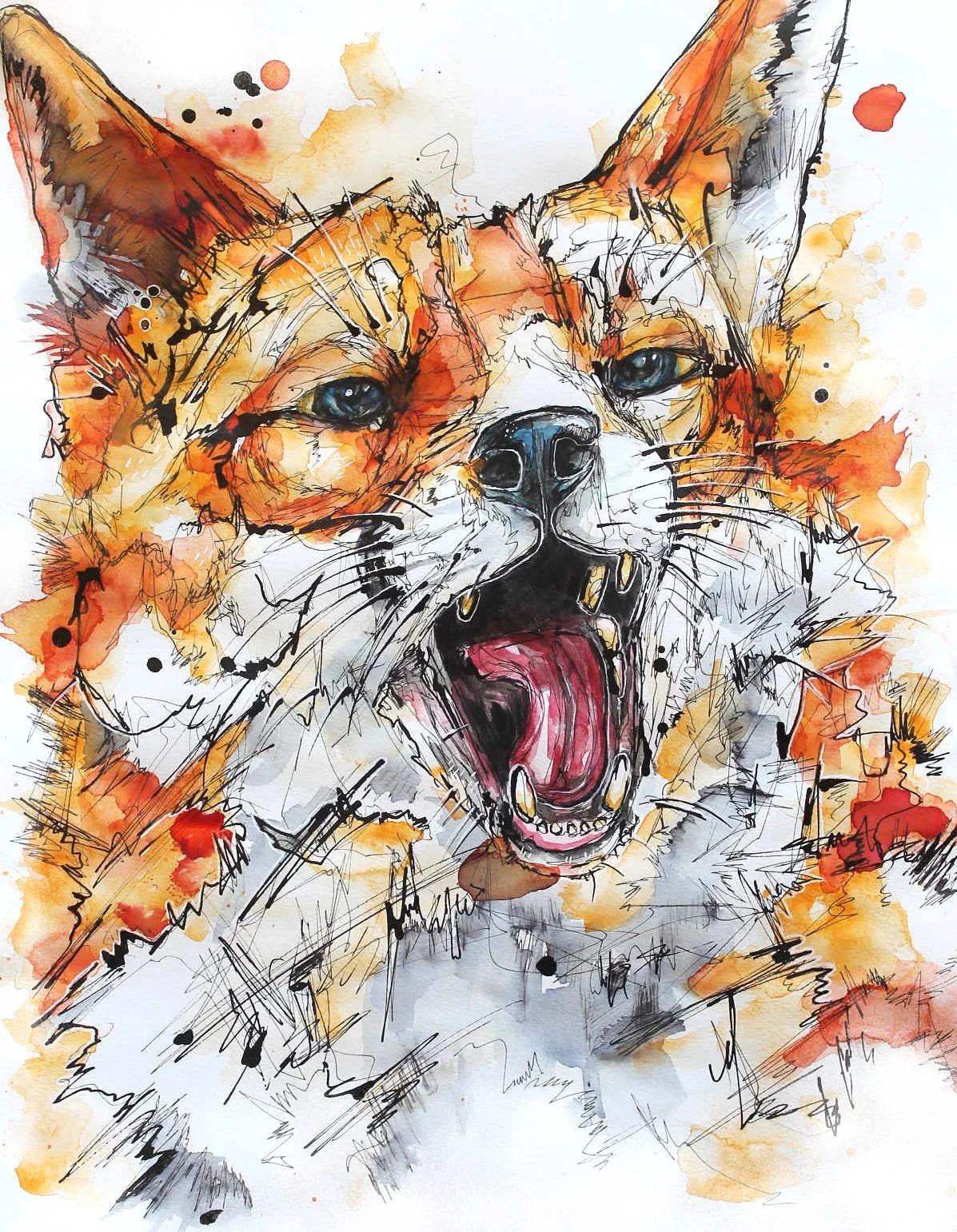 I’m really pleased with how my swift came out, the drawing was so simple and I worried I wouldn’t be able to make it look interesting, but with the help of Brusho I much prefer the swift to my fox image. I think because the image of the fox was so much larger (320mm × 410mm), it makes you a little more cautious, which restricts how mad you want to go with the paint. The fox was also made with Brusho and watercolour on 100lb paper.