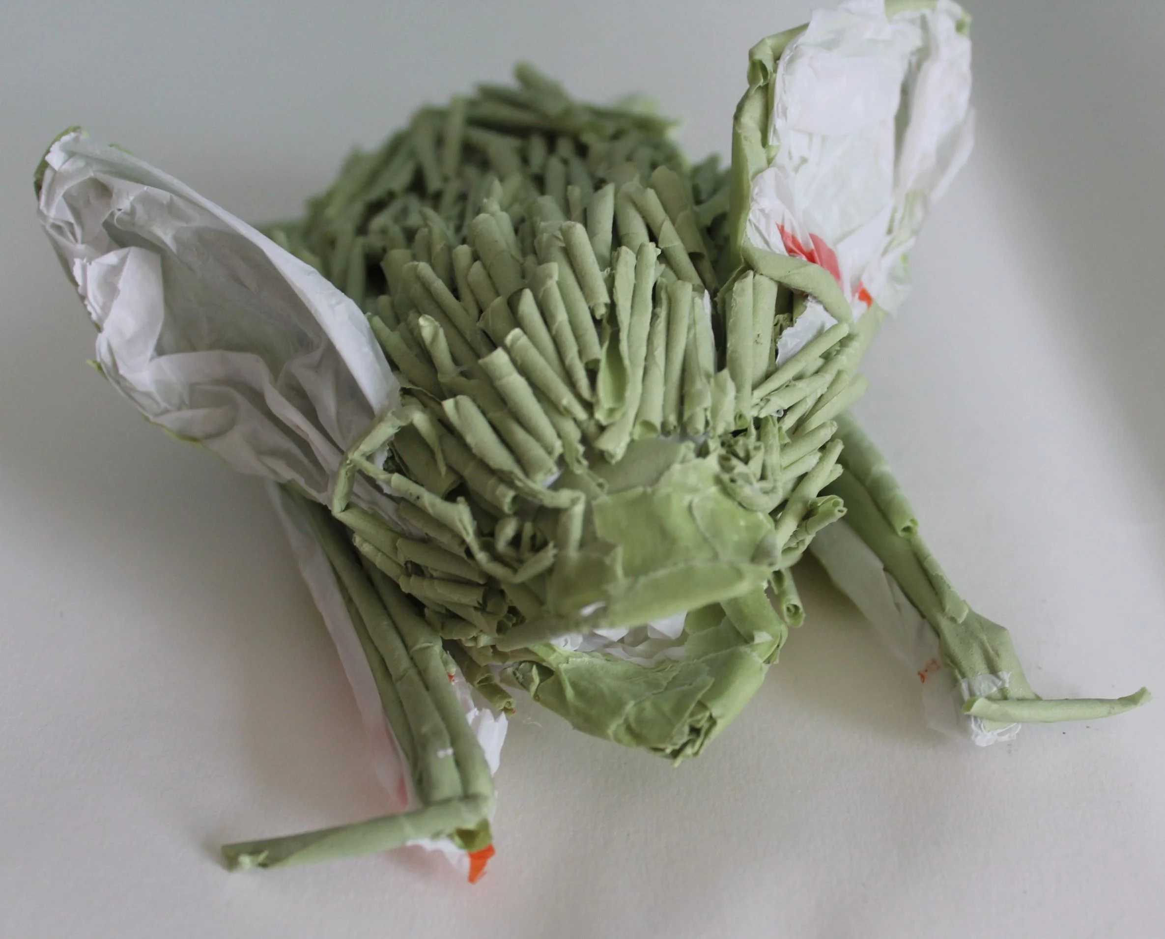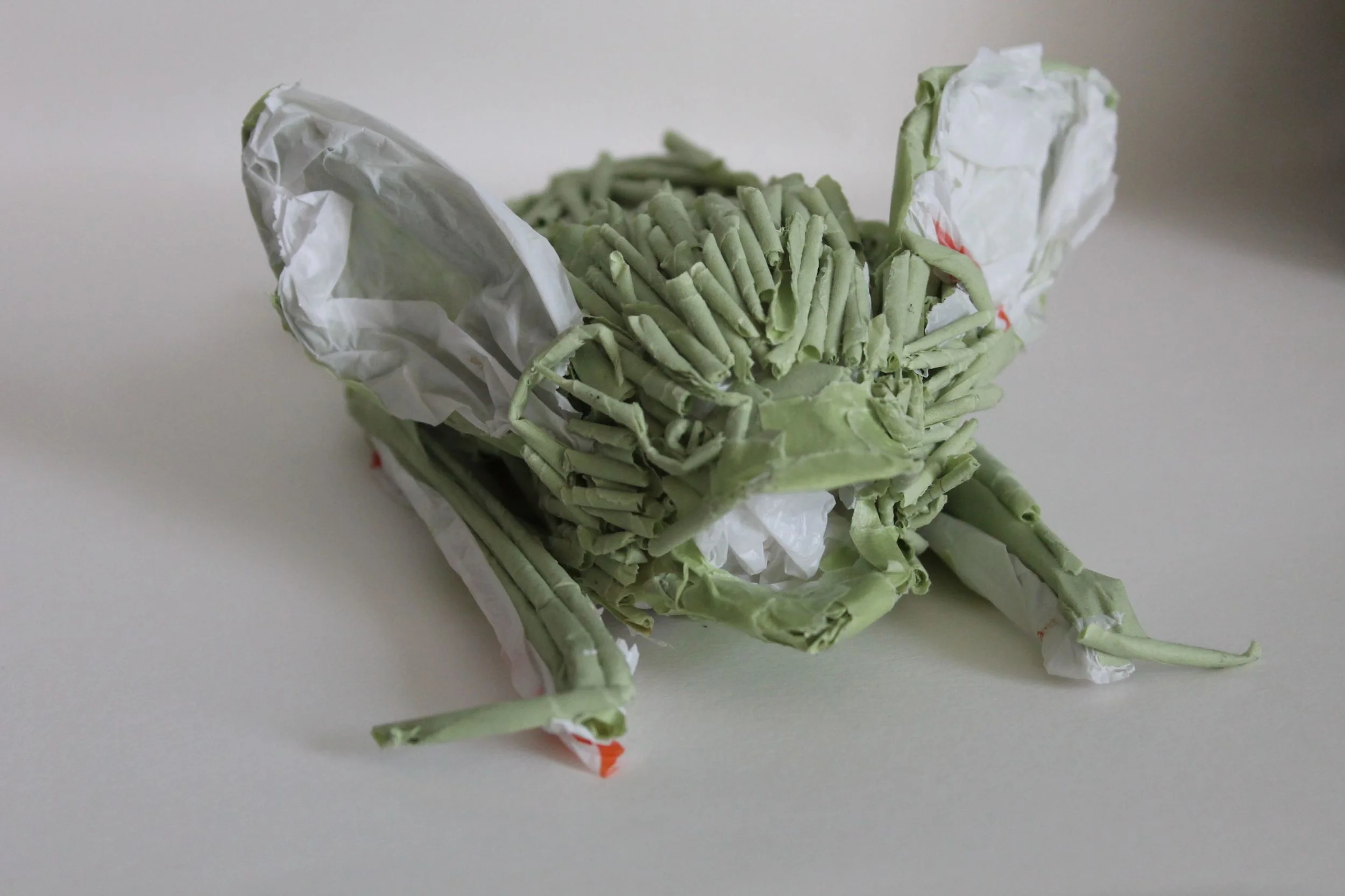 In lieu of my next Aesop fable illustration, I’ve made my own little long eared bat from rolled up tubes of masking tape and carrier bags. I really enjoyed making my masking tape cat when I was at Kingston University, so I thought I’d get the tape out and get busy with making another weird luminous green sticky creature.