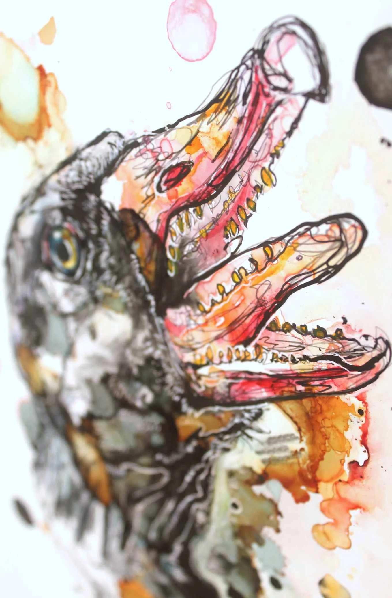 I used a 4B pencil to help me shade in a few areas and to create some scratchiness and after it was all dry went in with white pigment and white spirit to add some details and contrast.
